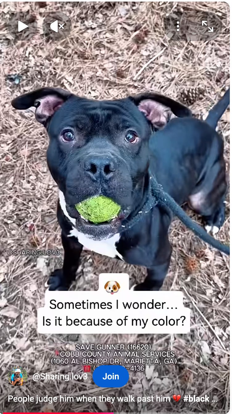 Once a dog comes into my awareness, it’s impossible to ignore. And this one – Gunner – is a one-year-old black Pittie – who came across my screen through a Cobb County Animal Services volunteer running the Sharing Love YouTube channel. Routinely, she posts to share dogs in immediate need – or else.